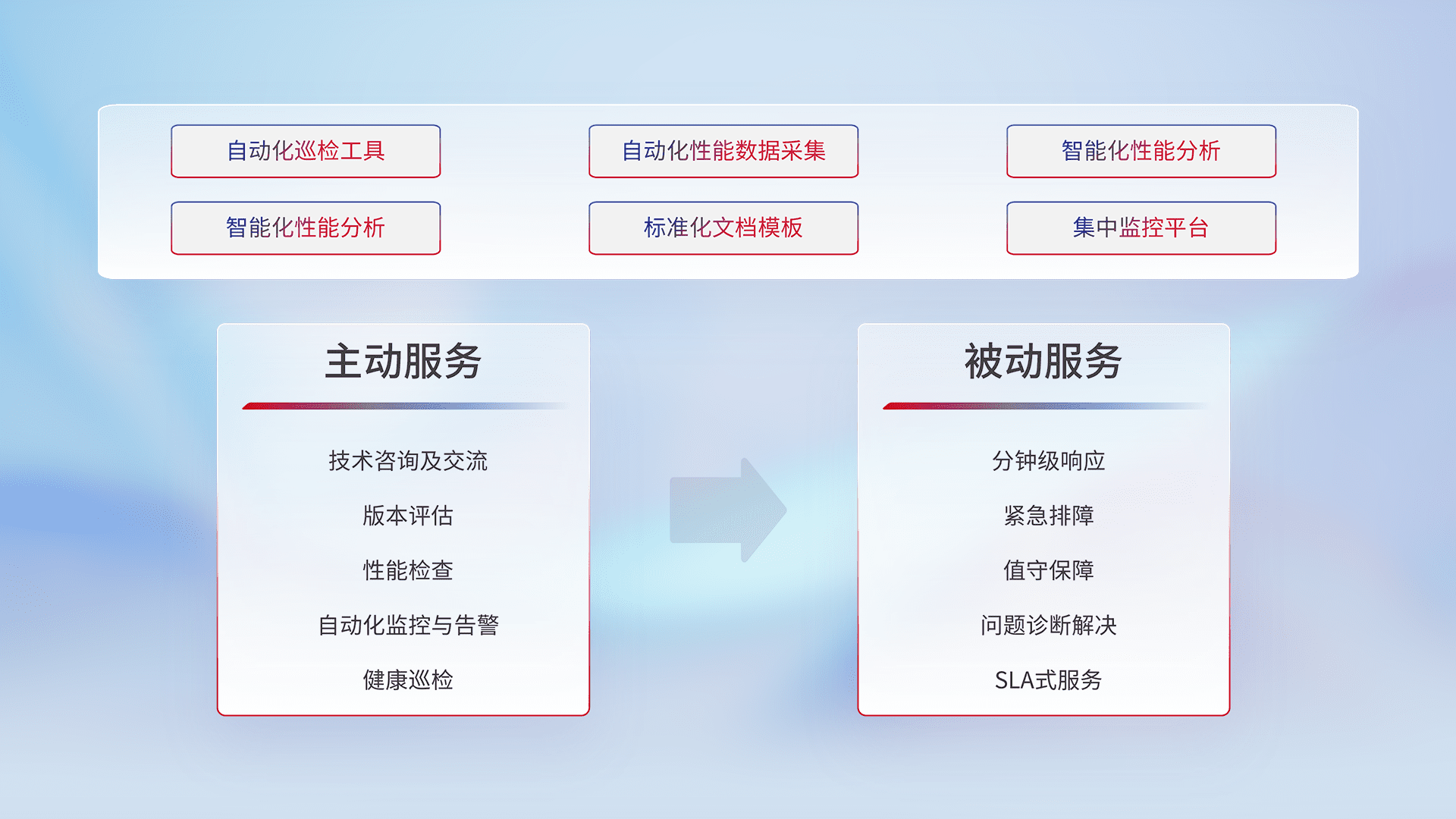 智能化工具和标准化文档,,,保障服务质量,,提供主动服务(包含技术咨询、、、版本评估、、性能检查、、自动化监控与告警、、、、健康巡检)和被动服务包含(分钟级响应、、、、紧急排障、、、值守保障、、、问题诊断解决、、、、SLA服务)。。。。