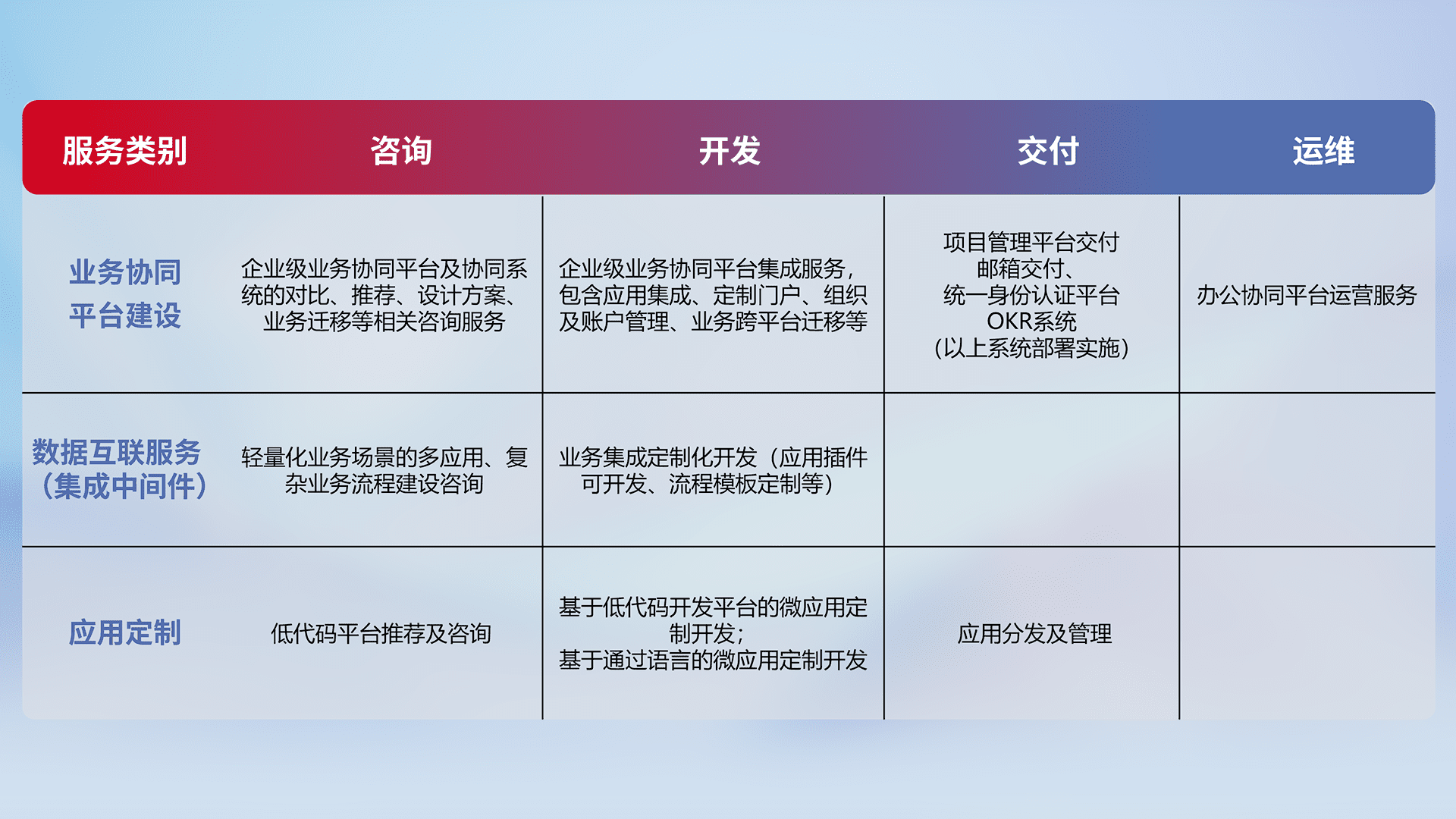 针对钉钉、、、企微、、、IDaas等平台级产品提供产品的规划、、方案、、、交付、、、定制化开发等服务,,,实现如统一协同办公、、、智能客户服务、、、混合会议管理、、智能数据查询、、、、等业务场景,,,,实现数字化转型。。。